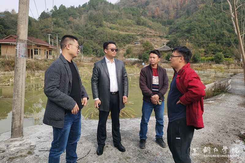 在亚茶村委会会议室,程寿峰和谭善德向梵净山国家公园研究院两位专家介绍了该村自然条件和产业发展现状及主要制约因素,重点介绍了该村水产养殖基地建设和运营现状。杨周向他们介绍了我校近年来服务乡村振兴产业发展的重要成果,尤其是我校在德江县开展稻蛙养殖及其经济效益的情况,同时针对亚茶村的自然条件向他们推荐了稻蛙养殖产业,并邀请他们来我校及稻蛙养殖基地作进一步考察。程寿峰和谭善德对杨周的邀请表示感谢,对稻蛙养殖产业表达了浓厚的兴趣,接着便带领大家前往该村养殖基地考察。在养殖基地,杨周对稻蛙养殖需要的水源和稻田及附属设施进行了详细考察和了解,认为亚茶村具备发展稻蛙养殖的各项条件,可以与铜仁学院合作开展稻蛙养殖。