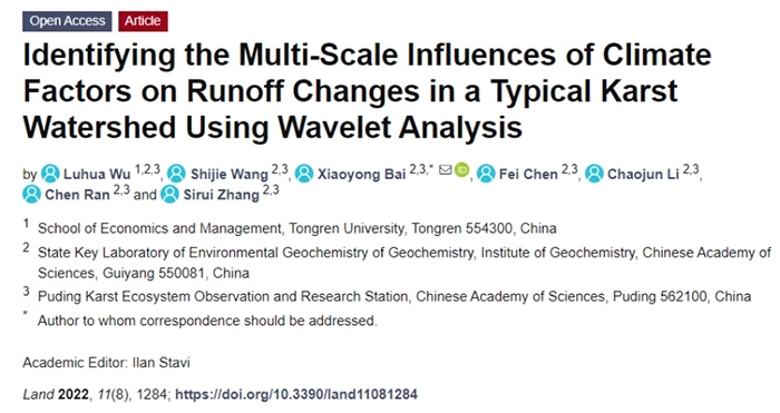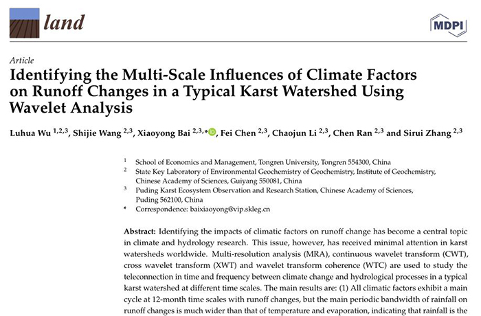 2022年8月,我校经济管理学院吴路华博士以第一作者在国际SCI期刊(中国科学院3区)《Land》上,在线发表题为《Identifying the multi-scale influences of climate factors on runoff changes in a typical karst watershed using wavelet analysis》的学术论文(Volume 11, August 2022, 1284;IF=3.905),耦合应用多种小波分析方法识别了气候因素对典型喀斯特流域径流量变化的多时间尺度影响。