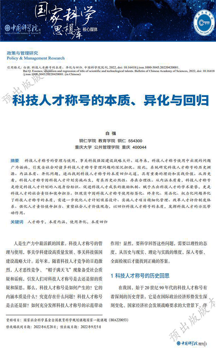 9月5日,国家科学思想库核心媒体、管理学研究领域重要期刊《中国科学院院刊》“政策与管理研究”栏目在线发表我校白强教授的研究成果《科技人才称号的本质、异化与回归》。9月7日,中国知网网络首发该成果。该成果将在《中国科学院院刊》2022年第10期纸质刊印面向国内外公开发行。成果共计10000余字,是白强教授主持的国家社科基金教育学规划课题“知识生产模式变革下高校学科建设高质量发展的路径创新”(立项编号:BIA220053)的又一阶段性研究成果。