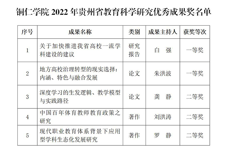 12月26日,省教育厅关于公布了2022年贵州省教育科学研究优秀成果获奖名单,我校报送的5项成果均获奖,其中一等奖2项、二等奖3项,获奖数在全省高校中位列第4,创下了我校在此奖项上的最好成绩。这充分展现了我校教育学科的研究实力与水平,有效推进了我校科技事业的高质量发展。