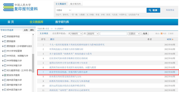 此次发表的论文是继发表于CSSCI来源期刊《高校教育管理》2020年第6期《本科层次职业学校学科选择及建设策略——兼论职业学科》(被中国人民大学复印报刊资料《职业技术教育》2021年第4期全文转载)与发表在CSSCI来源期刊《教育发展研究》2021年第13-14期《职业学科的内在逻辑审视》等论文之后,关于职业学科领域研究的最新成果。该论文认为,职业学科体系的构建是职业学科自身发展的内在需求,也是我国职业教育体系及整个教育体系建设的需要。因为职业学科体系既是技术技能型人才培养的“知识大粮仓”,也是职业院校颁发职业学位的“特别通行证”。我国职业学科体系构建的路径主要有三条:一是直接借用普通教育学科体系构建职业学科体系,二是以普通教育学科体系为参照构建职业学科体系;三是依据我国职业分类构建职业学科体系。其中,第二条构建路径是目前国家层面构建职业学科体系的最佳选择。但是,从长远看,国家应该选择第三条路径构建出属于职业教育的独特职业学科体系。这才符合高质量发展对职业学科体系构建的要求,才与创造职业教育尤其是职业高等教育“中国经验”的地位相匹配。