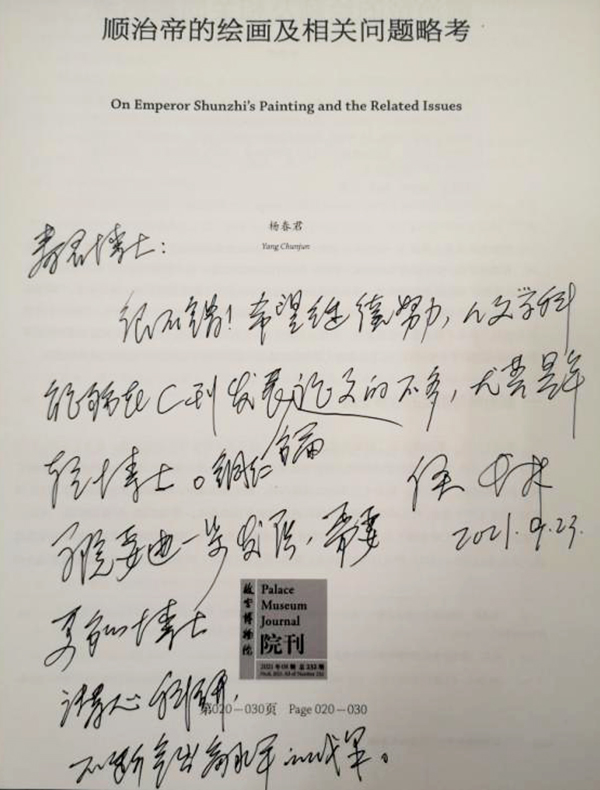 近日获悉,我校人文学院历史系杨春君博士在《故宫博物院院刊》2021年第8期上发表了题为《顺治帝的绘画及相关问题略考》的论文。该刊系考古学CSSCI刊物。