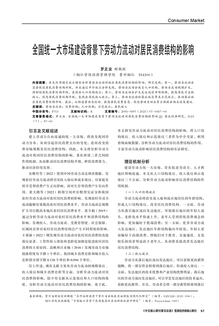 近日,我校副教授、博士罗正业独著的论文《全国统一大市场建设背景下劳动力流动对居民消费结构的影响》在《商业经济研究》发表。该论文是罗正业主持的贵州省理论创新课题“合作治理视角下贵州省县级政府治理能力现代化研究”(GZCLH-2021-308)和铜仁学院校级课题“乡村振兴背景下农村基层社会治理绩效提升研究”(Trxyxwdxm-049)的阶段性成果。