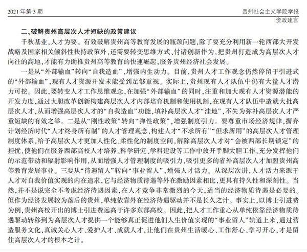 近日,我校教育学院白强教授依托其主持完成的贵州省教育科学规划重点课题《贵州省高等教育发展瓶颈、影响因素及赶超策略研究》撰写的资政报告《关于破解贵州高层次人才短缺问题的建议》,经严格审核、推荐,被《贵州社会主义学院学报》第3期“资政建言”专栏采纳。该报告是白强教授在前期高等教育理论研究基础上聚焦我省高等教育改革发展、为推动我省高等教育快速崛起建言献策的又一应用性研究成果。
