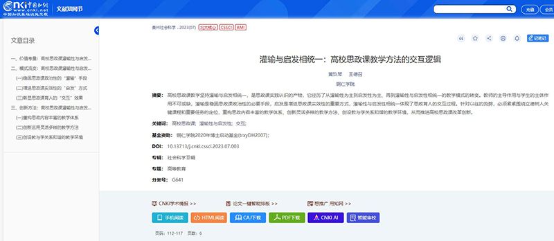 日前,我校马克思主义学院黄玖琴教授和王德召教授合著的论文《灌输与启发相统一:高校思政课教学方法的交互逻辑》,发表在人文社会科学学术理论重要期刊《贵州社会科学》2023年第7期。该文认为,高校思政课教学坚持灌输与启发相统一,是思政课实践认识的产物,它经历了从灌输性为主到启发性为主、再到灌输性与启发性相统一的教学模式的转变。教师的主导作用与学生的主体作用不可或缺,灌输是稳固思政课政治性的必要手段,启发是增进思政课实效性的重要方式,灌输性与启发性相统一体现了思政育人的交互过程。