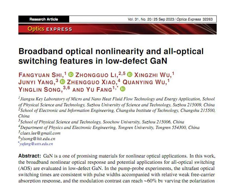 近日,大数据学院肖政国博士与苏州科技大学合作的论文“Broadband optical nonlinearity and all-optical switching features in low-defect GaN”发表于SCI期刊《Optics Express》。