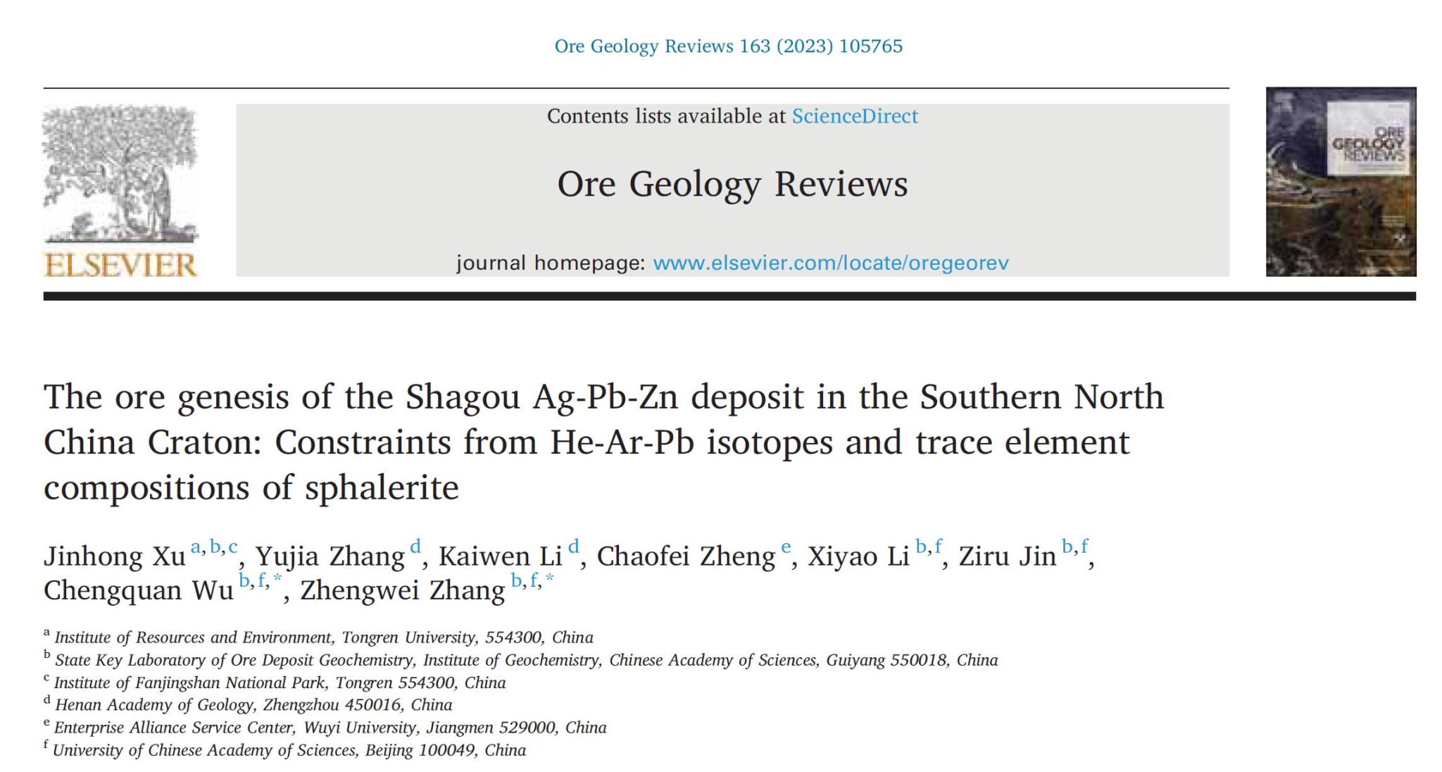 我校经济管理学院、梵净山国家公园研究院徐进鸿博士在其博士阶段工作基础上,与中国科学院地球化学研究所、河南省豫地科技集团有限公司、河南省地质研究院、河南发恩德矿业有限公司等单位合作,以豫西下峪矿田最典型的沙沟和铁炉坪大型矿床为研究对象,通过开展矿物学、同位素地球化学、流体包裹体、原位矿物微量元素等分析,发现银主要以(银)黝铜矿、硫锑铜银矿、辉银矿和自然银等含银矿物产出,少量以次显微包体银为赋存在硫化物中;C-O-S-He-Ar-Pb同位素分析表明成矿物质来源受到岩浆、上元古界官道口群、栾川群和陶湾群碳酸盐岩-页岩-硅质岩建造和围岩太华群共同控制;流体包裹体显微测温和闪锌矿原位微量元素表明成矿流体具有中低温、中低盐度的岩浆热液特征;此外通过区域对比发现这些矿床的深边部具有形成斑岩型Cu-Au-Mo矿床的潜力,为矿山深部矿产资源勘查提供了重要依据。相关成果以徐进鸿博士作为第一作者发表在矿床学权威期刊《Ore Geology Reviews》(SCI二区)和《矿物岩石地球化学通报》(北大核心)上。