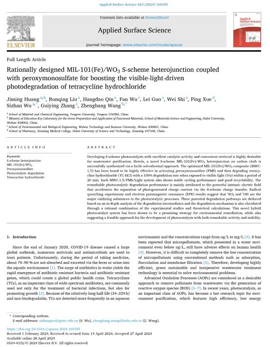 近日,我校材料与化学工程学院黄继明博士在《Applied Surface Science》上发表了题为“Rationally designed MIL-101(Fe)/WO3 S-scheme heterojunction coupled with peroxymonosulfate for boosting the visible-light-driven photodegradation of tetracycline hydrochloride”的研究论文。论文是该院环境功能材料与水污染控制科研团队最新研究成果,文章以铜仁学院为第一单位,研究成果得到了国家自然科学基金、贵州省教育厅工程研究中心、贵州省教育厅协同创新中心和铜仁市科技局等项目的联合资助。