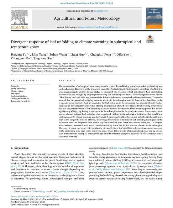 近日,我校农林工程与规划学院于海英博士在《Agricultural and Forest Meteorology》上发表了题为“Divergent response of leaf unfolding to climate warming in subtropical and temperate zones”的研究论文。论文是该院植物物候与全球变化生态学科研团队最新研究成果,文章以铜仁学院为第一单位,研究成果得到了国家自然科学基金和贵州省科技计划项目的联合资助。
