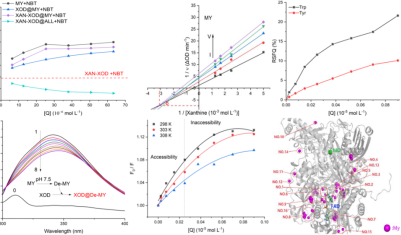 该项研究成果是在铜仁学院生物资源综合利用与开发课题组构建的地方本科院校材料与化工类新工科人才创新实践能力培养模式的探索与实践新教育模式培养下产出的重要成果之一。研究表明:杨梅素的确是一种强效的XOD抑制剂,其最大抑制率达到33.78%,并进一步分析表明,杨梅素的去质子化形式(De-MY)在与XOD的相互作用中更为有效。在抑制动力学方面,De-MY表现出混合型抑制,其中竞争性抑制占主导地位。通过热力学分析和同步荧光数据分析揭示了De-MY与XOD在低浓度范围内的静态淬灭过程,这主要归因于De-MY与XOD之间的可及性相互作用。分子动力学模拟进一步显示,杨梅素通过与XOD中的Trp 283、Arg-60和Tyr 58形成氢键相互作用,有效阻止了FADH2向O2的自由电子转移。