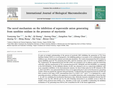 近日,铜仁学院生物资源综合利用与开发课题组2022级化学工程与工艺专业本科生马傲等同学在姚元勇、陈仕学老师的共同指导下,完成“The novel mechanism on the inhibition of superoxide anion generating from xanthine oxidase in the presence of myricetin”研究工作。2024年11月,该项研究成果在International Journal of Biological Macromolucules”国际学术期刊在线发表。该杂志为中科院一区TOP期刊,IF 7.7。