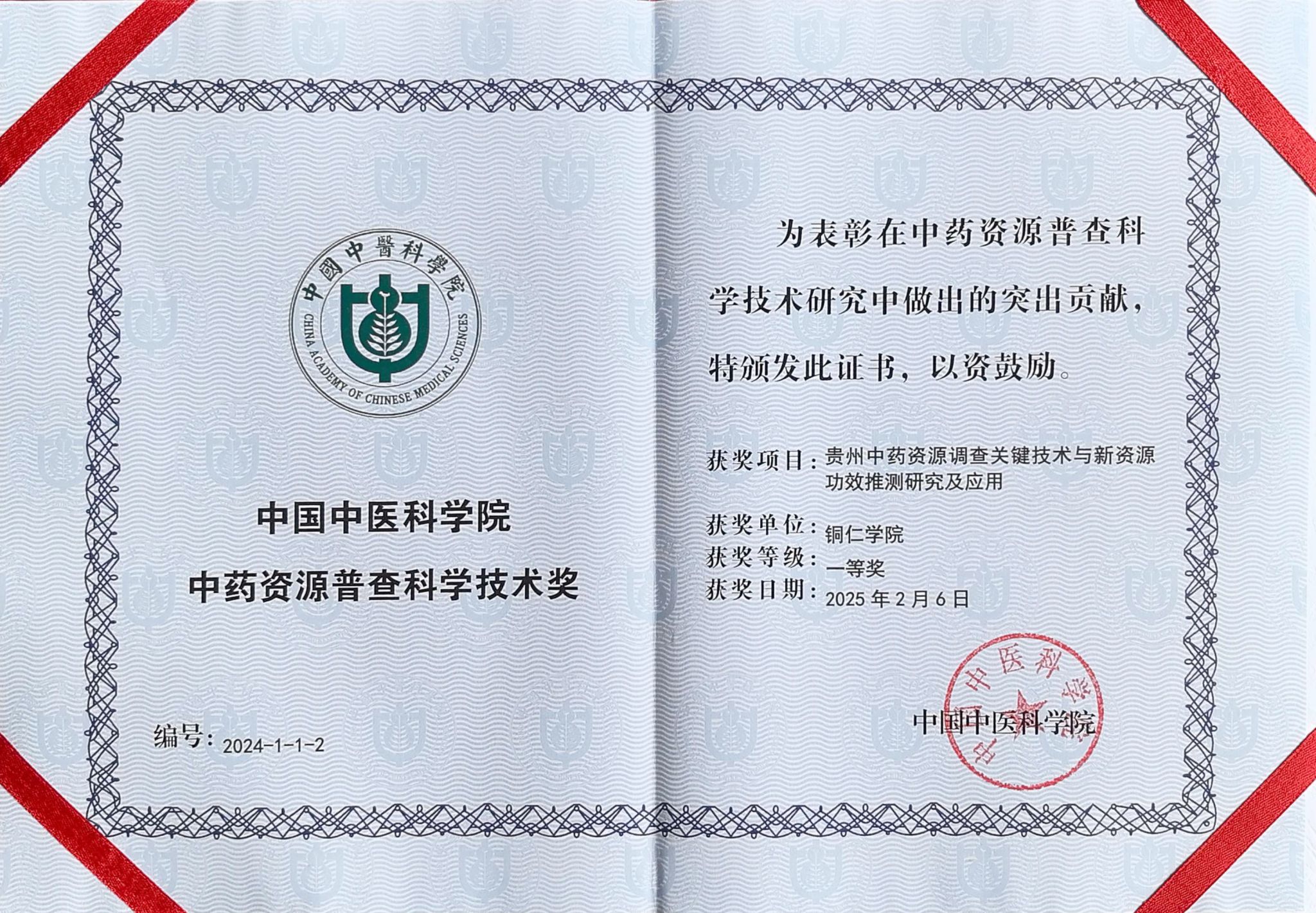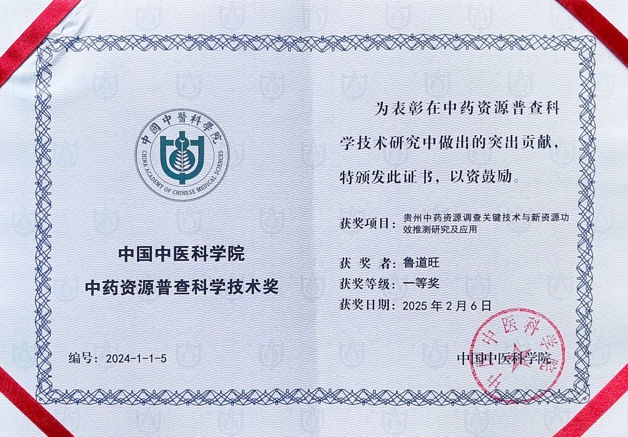 近日,中国中医科学院发布《关于2024年度中国中医科学院中药资源普查科学技术奖励的决定》,由贵州省中药资源普查技术依托单位贵州中医药大学联合我校等多家单位共同申报,我校教师鲁道旺等人主要完成的项目“贵州中药资源调查关键技术与新资源功效推测研究及应用”,荣获2024年度中国中医科学院中药资源普查科学技术奖一等奖。