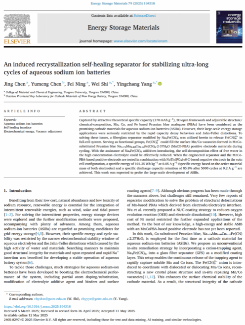 该成果以“An induced recrystallization self-healing separator for stabilizing ultra-long cycles of aqueous sodium ion batteries”为题发表在《Energy Storage Materials》期刊,陈静博士为第一作者、石维教授和杨应昌教授为通讯作者,铜仁学院为第一署名单位。《Energy Storage Materials》(储能材料)期刊由国际知名出版集团爱思唯尔(Elsevier)发行,专注于能源存储材料的前沿研究,在2025年中国科学院最新SCI期刊分区中被归类为材料科学类一区Top期刊,影响因子为18.9。