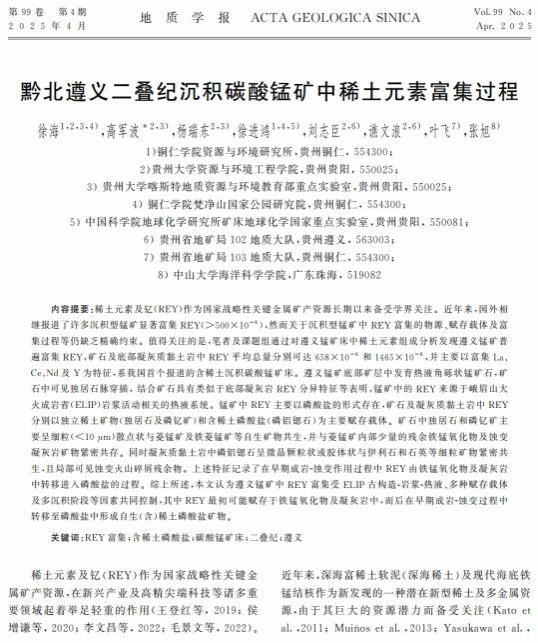 近期,我校经济管理学院徐海博士在卓越期刊《地质学报》发表研究论文《黔北遵义二叠纪沉积碳酸锰矿中稀土元素富集过程》,铜仁学院为第一署名单位,徐海博士为第一作者,贵州大学高军波教授为通讯作者。