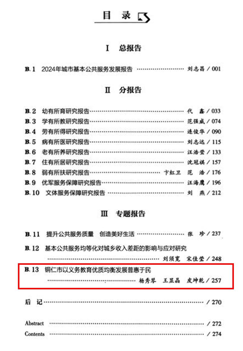 2025年5月,中国社会科学院马克思主义研究院、华图政信公共管理研究院、社会科学文献出版社在京共同发布了《公共服务蓝皮书:中国城市基本公共服务力评价(2024)》。全书包括总报告、分报告、专题报告三个部分。专题报告对公共服务助力美好生活的逻辑理路、实践经验及现实要求,基本公共服务均等化对城乡收入差距的影响与政策建议,铜仁市义务教育优质均衡发展的主要做法、成效及经验等热点问题进行了重点研究。我校师生的研究成果《铜仁市以义务教育优质均衡发展普惠于民》入选该书的专题报告中。