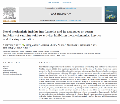 2025年6月,我校材料与化学工程学院生物资源综合利用与开发课题组在国际Top期刊《Food Bioscience》(Q1,影响因子5.9)发表题为“Novel mechanistic insights into Luteolin and its analogues as potent inhibitors of xanthine oxidase activity: Inhibition thermodynamics, kinetics and docking simulation”的研究论文。该论文工作由化学工程与工艺专业2021、2022、2023级本科生陈佳荣、马傲、黄琪、晏江洲在姚元勇、陈仕学两位老师的指导下共同完成,充分展示了我校本科生在科研创新与实践方面的突出能力。