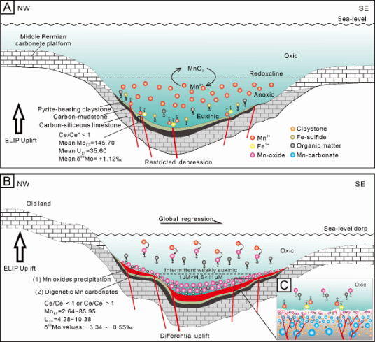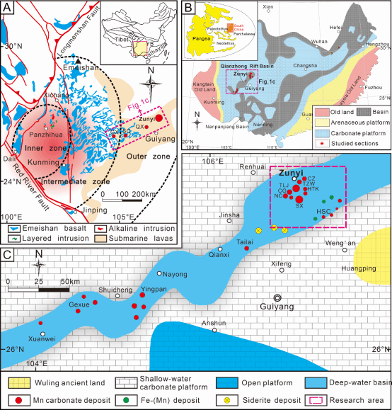针对上述问题,我校徐海博士(第一作者)与中国科学院地球化学研究所尹润生研究员(通讯作者)、贵州大学资源与环境工程学院高军波教授和杨瑞东教授、铜仁学院徐进鸿博士等合作,对贵州遵义二叠纪锰矿床(图1)开展了系统的地质、地球化学和C-S-Mo同位素研究,厘定了遵义锰矿中碳酸锰矿物的沉淀机制,重建了锰质沉淀过程中盆地水体氧化还原结构的动态演变细节及控制因素,建立了海退+地壳隆升驱动盆地水体氧化还原界面向下扩张触发锰质大规模沉淀和矿化的成矿模式。在此基础上结合更广泛地质历史时期沉积锰矿沉淀途径的相关证据,提出地质历史时期沉积碳酸锰矿是古海洋由缺氧条件向氧化条件转变的产物,可以作为古海洋氧化还原波动的有力指标,其形成与同时期海洋氧化还原扰动有密切的成因联系。