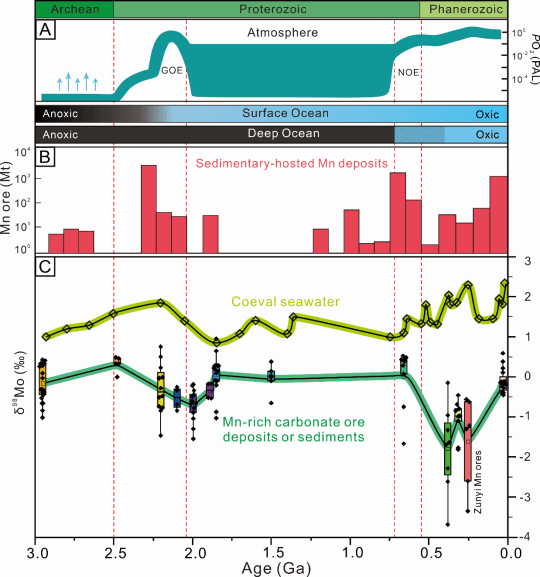 锰(Mn)是一种关键金属和氧化敏感元素,对海洋氧化还原变化极为敏感,在地球化学循环过程中易于发生矿物相转变。在缺氧水体中Mn以溶解态Mn(II)存在,而在氧化水体条件下转化为不溶态Mn(III/IV)。因此,沉积序列中的锰(III/IV)氧化物的存在被认为是评估地球早期氧化历程和局部环境氧化还原波动的关键窗口。人们普遍认为,地质历史时期沉积锰矿床的形成与地球系统的逐渐氧化有关。为此,几乎所有具有经济价值的锰矿都是在大氧化事件(GOE)之后形成的。然而,地质历史时期沉积型锰矿床主要由碳酸锰(II)矿组成,通过锰碳酸盐示踪古海洋氧化还原变化依赖于对其形成机制的精确限制。