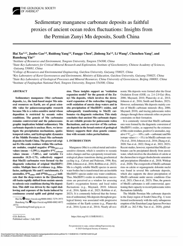 近日,我校徐海博士在国际顶级地学期刊(SCI一区TOP期刊)《Geological Society of America Bulletin》(美国地质学会会刊,简称GSA Bulletin)上发表了题为《Sedimentary manganese carbonate deposits as faithful proxies of ancient ocean redox fluctuations: Insights from the Permian Zunyi Mn deposits, South China》的最新研究成果,为限定沉积碳酸锰矿沉淀机制及其与古海洋氧化还原扰动之间的潜在关联提出了新的认识。