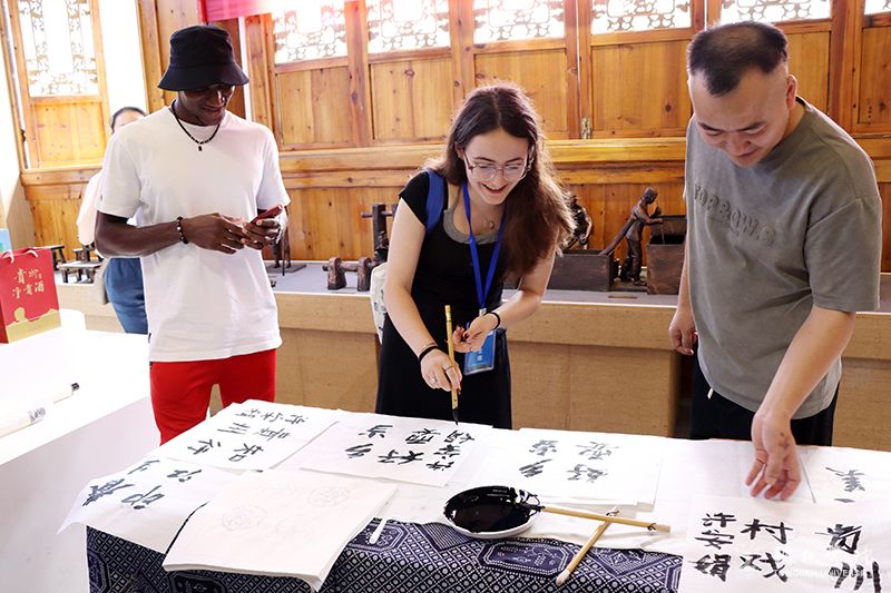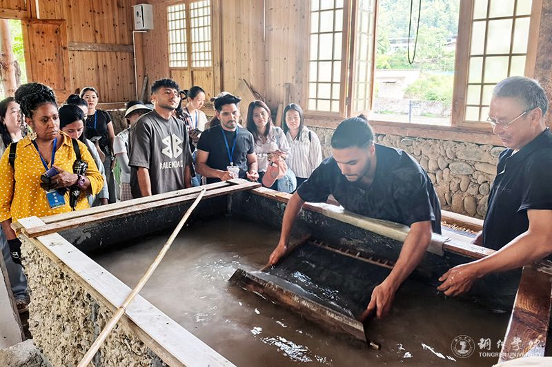 舞龙舞狮、木雕、刺绣、造纸书法、傩戏、抹茶,都承载着独特的历史文化。在铜仁学院里,中外青年学子学习体验了舞龙舞狮和木雕石刻,了解我校在传承发扬中华优秀传统文化和非遗文化技艺的典型做法;在中南门古城,大家深入黔秀非遗传承馆,了解黔秀文化、学习苗绣技艺,感受刺绣的传统技艺之美。在书法之乡印江,大家亲身体验古法造纸,深入学习了解印江合水古法造纸的72道工序,体会中国人民的劳动智慧;参观书法展陈、学习书法、书写汉字,感受书法的文化内涵和品质精神。在傩堂戏艺术之乡德江,大家深入傩戏博物馆参观学习,了解傩戏文化与土家人民的日常生活。大家还到江口抹茶基地,参观抹茶生产线,学习点茶技艺,体验抹茶文化魅力。