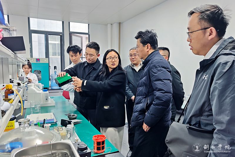 郑光鑫一行首先走进材料与化学工程学院实验室,实地察看实验室建设布局、科研设备配置及相关技术研发进展,详细了解我校在新型功能材料研发、矿产资源综合利用等领域的科研成果与技术优势,对我校立足地方产业需求开展科研攻关的思路和成效给予肯定。