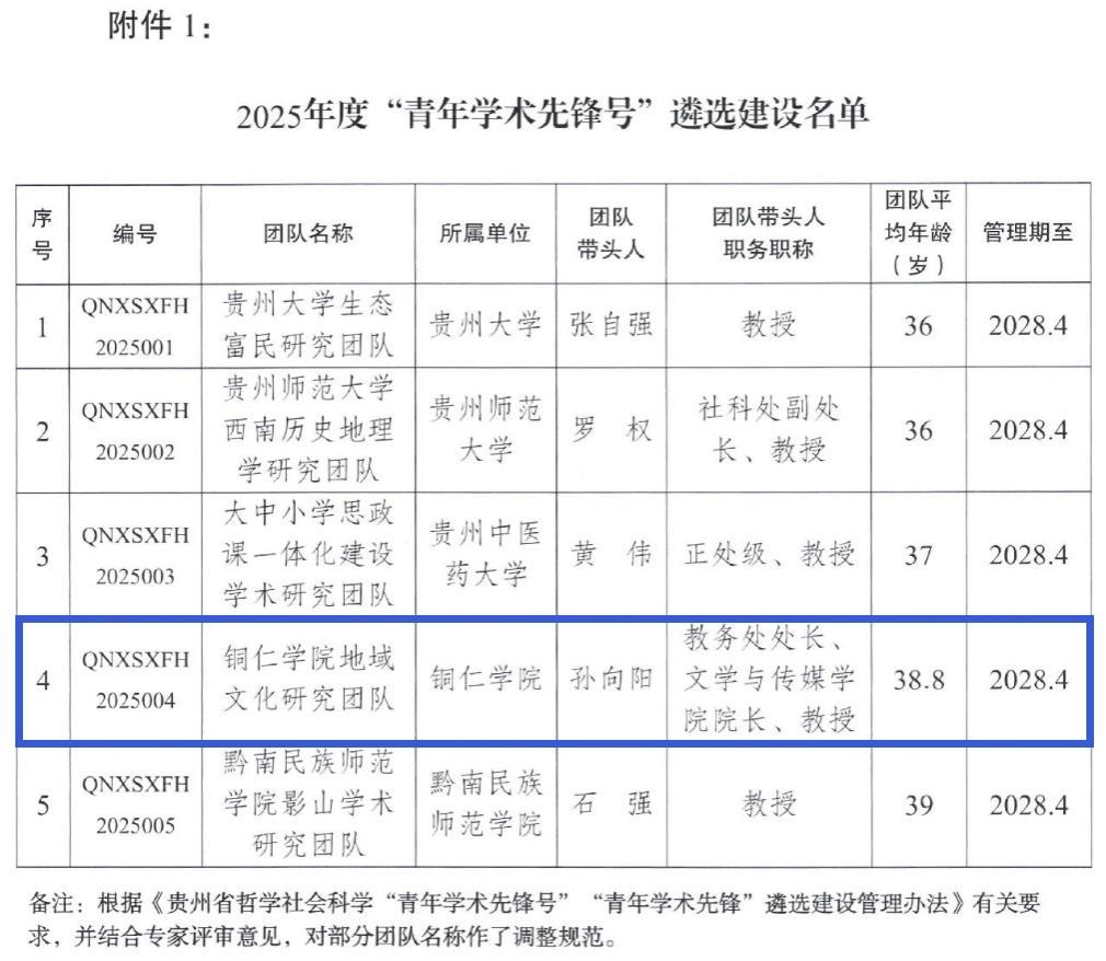 近日,贵州省社会科学联合会、贵州省教育厅公布了2025年度贵州省哲学社会科学“青年学术先锋号”评选结果。经组织申报、专家评审等环节,最终遴选出5个“青年学术先锋号”。由我校教务处处长、文学与传媒学院院长孙向阳教授领衔的“铜仁学院区域文化研究团队”成功入选,这标志着我校哲学社会科学平台建设再上新台阶。